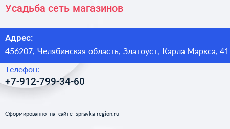 Усадьба, сеть магазинов по адресу 456207, Челябинская область, Златоуст, Карла Маркса, 41 в дальнейшем Организация, размещена в следующих категориях: