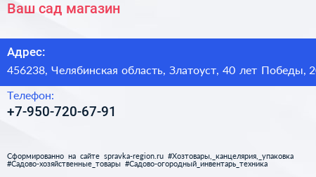 Ваш сад, магазин по адресу 456238, Челябинская область, Златоуст, 40 лет Победы, 20 в дальнейшем Организация, размещена в следующих категориях: