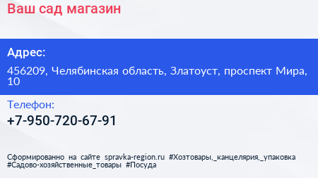 Ваш сад, магазин по адресу 456209, Челябинская область, Златоуст, проспект Мира, 10 в дальнейшем Организация, размещена в следующих категориях: