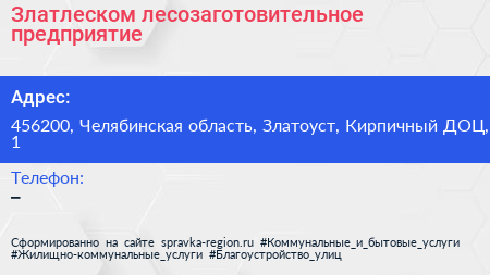 Златлеском, лесозаготовительное предприятие по адресу 456200, Челябинская область, Златоуст, Кирпичный ДОЦ, 1 в дальнейшем Организация, размещена в следующих категориях: