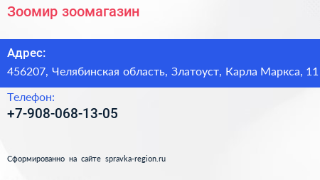 Зоомир, зоомагазин по адресу 456207, Челябинская область, Златоуст, Карла Маркса, 11 в дальнейшем Организация, размещена в следующих категориях: