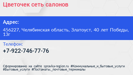 Цветочек, сеть салонов по адресу 456227, Челябинская область, Златоуст, 40 лет Победы, 13г в дальнейшем Организация, размещена в следующих категориях: