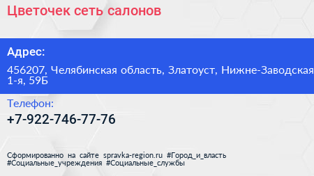 Цветочек, сеть салонов по адресу 456207, Челябинская область, Златоуст, Нижне-Заводская 1-я, 59Б в дальнейшем Организация, размещена в следующих категориях: