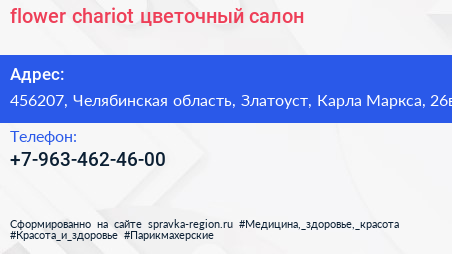 flower chariot, цветочный салон по адресу 456207, Челябинская область, Златоуст, Карла Маркса, 26в в дальнейшем Организация, размещена в следующих категориях: