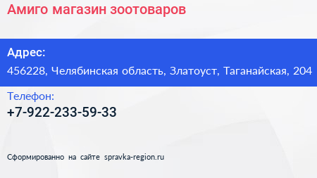 Амиго, магазин зоотоваров по адресу 456228, Челябинская область, Златоуст, Таганайская, 204 в дальнейшем Организация, размещена в следующих категориях: