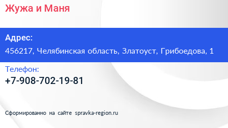 Жужа и Маня по адресу 456217, Челябинская область, Златоуст, Грибоедова, 1 в дальнейшем Организация, размещена в следующих категориях: