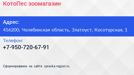КотоПес, зоомагазин по адресу 456200, Челябинская область, Златоуст, Косотурская, 1 в дальнейшем Организация, размещена в следующих категориях: