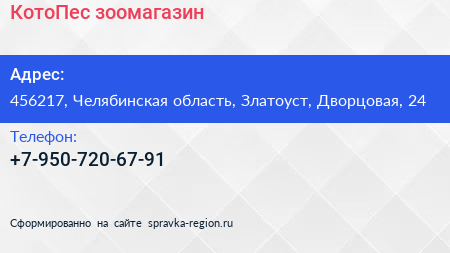 КотоПес, зоомагазин по адресу 456217, Челябинская область, Златоуст, Дворцовая, 24 в дальнейшем Организация, размещена в следующих категориях: