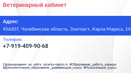 Ветеринарный кабинет по адресу 456207, Челябинская область, Златоуст, Карла Маркса, 14 в дальнейшем Организация, размещена в следующих категориях: