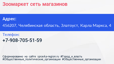 Зоомаркет, сеть магазинов по адресу 456207, Челябинская область, Златоуст, Карла Маркса, 4 в дальнейшем Организация, размещена в следующих категориях: