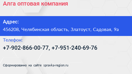 Алга, оптовая компания по адресу 456208, Челябинская область, Златоуст, Садовая, 9а в дальнейшем Организация, размещена в следующих категориях: