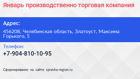 Январь, производственно-торговая компания по адресу 456208, Челябинская область, Златоуст, Максима Горького, 5 в дальнейшем Организация, размещена в следующих категориях: