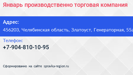 Январь, производственно-торговая компания по адресу 456203, Челябинская область, Златоуст, Генераторная, 55а в дальнейшем Организация, размещена в следующих категориях: