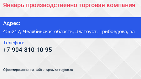 Январь, производственно-торговая компания по адресу 456217, Челябинская область, Златоуст, Грибоедова, 5а в дальнейшем Организация, размещена в следующих категориях: