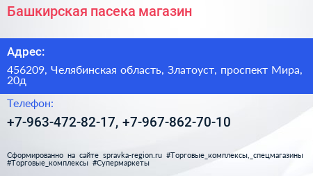 Башкирская пасека, магазин по адресу 456209, Челябинская область, Златоуст, проспект Мира, 20д в дальнейшем Организация, размещена в следующих категориях: