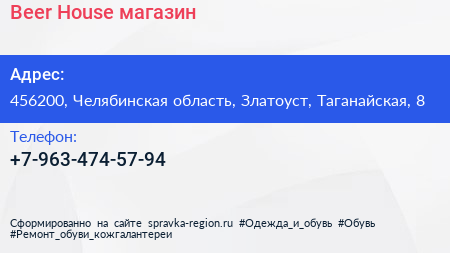 Beer House, магазин по адресу 456200, Челябинская область, Златоуст, Таганайская, 8 в дальнейшем Организация, размещена в следующих категориях: