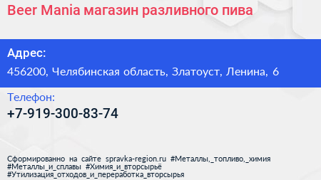 Beer Mania, магазин разливного пива по адресу 456200, Челябинская область, Златоуст, Ленина, 6 в дальнейшем Организация, размещена в следующих категориях: