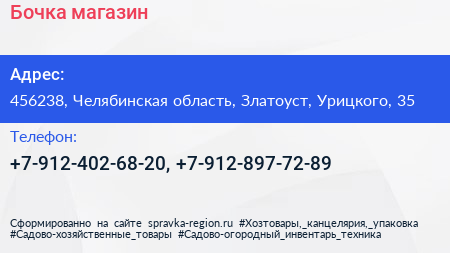 Бочка, магазин по адресу 456238, Челябинская область, Златоуст, Урицкого, 35 в дальнейшем Организация, размещена в следующих категориях: