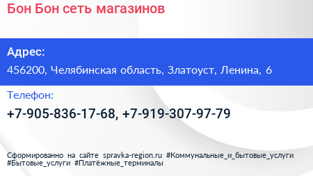 Бон-Бон, сеть магазинов по адресу 456200, Челябинская область, Златоуст, Ленина, 6 в дальнейшем Организация, размещена в следующих категориях: