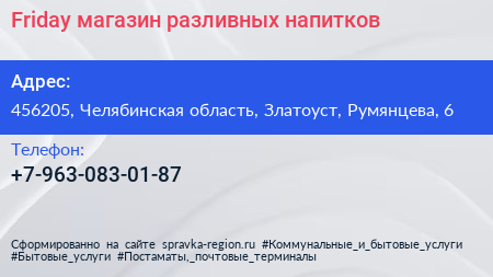 Friday, магазин разливных напитков по адресу 456205, Челябинская область, Златоуст, Румянцева, 6 в дальнейшем Организация, размещена в следующих категориях: