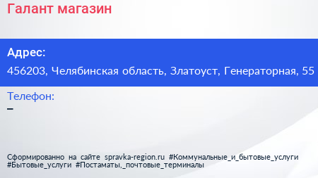 Галант, магазин по адресу 456203, Челябинская область, Златоуст, Генераторная, 55 в дальнейшем Организация, размещена в следующих категориях: