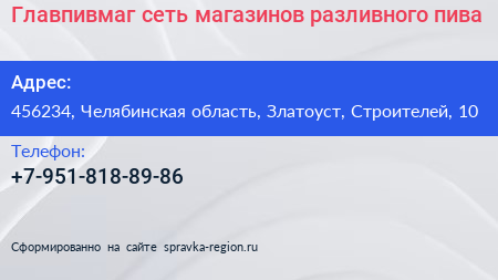 Главпивмаг, сеть магазинов разливного пива по адресу 456234, Челябинская область, Златоуст, Строителей, 10 в дальнейшем Организация, размещена в следующих категориях: