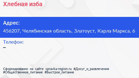 Хлебная изба по адресу 456207, Челябинская область, Златоуст, Карла Маркса, 6 в дальнейшем Организация, размещена в следующих категориях: