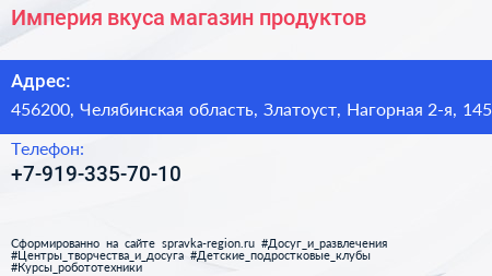 Империя вкуса, магазин продуктов по адресу 456200, Челябинская область, Златоуст, Нагорная 2-я, 145 в дальнейшем Организация, размещена в следующих категориях: