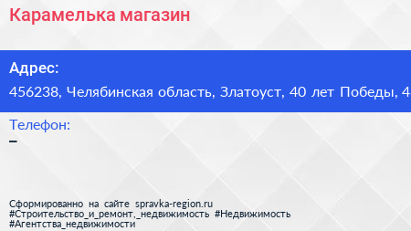 Карамелька, магазин по адресу 456238, Челябинская область, Златоуст, 40 лет Победы, 48 в дальнейшем Организация, размещена в следующих категориях: