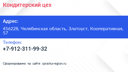Кондитерский цех по адресу 456228, Челябинская область, Златоуст, Кооперативная, 57 в дальнейшем Организация, размещена в следующих категориях: