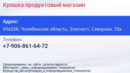 Крошка, продуктовый магазин по адресу 456228, Челябинская область, Златоуст, Северная, 31в в дальнейшем Организация, размещена в следующих категориях: