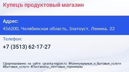 Купецъ, продуктовый магазин по адресу 456200, Челябинская область, Златоуст, Ленина, 22 в дальнейшем Организация, размещена в следующих категориях: