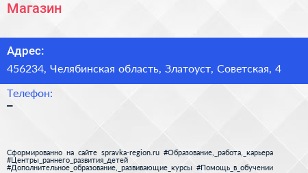 Магазин по адресу 456234, Челябинская область, Златоуст, Советская, 4 в дальнейшем Организация, размещена в следующих категориях: