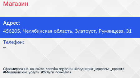 Магазин по адресу 456205, Челябинская область, Златоуст, Румянцева, 31 в дальнейшем Организация, размещена в следующих категориях: