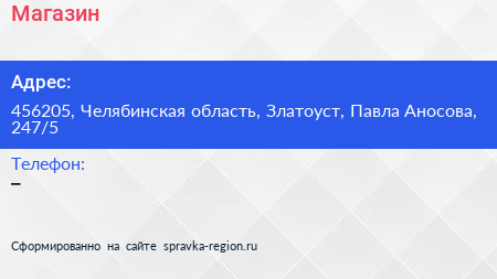 Магазин по адресу 456205, Челябинская область, Златоуст, Павла Аносова, 247/5 в дальнейшем Организация, размещена в следующих категориях: