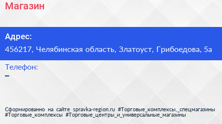 Магазин по адресу 456217, Челябинская область, Златоуст, Грибоедова, 5а в дальнейшем Организация, размещена в следующих категориях: