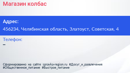 Магазин колбас по адресу 456234, Челябинская область, Златоуст, Советская, 4 в дальнейшем Организация, размещена в следующих категориях: