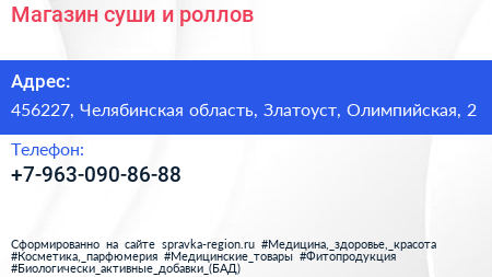 Магазин суши и роллов по адресу 456227, Челябинская область, Златоуст, Олимпийская, 2 в дальнейшем Организация, размещена в следующих категориях: