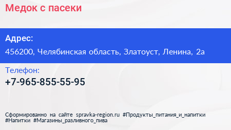 Медок с пасеки по адресу 456200, Челябинская область, Златоуст, Ленина, 2а в дальнейшем Организация, размещена в следующих категориях: