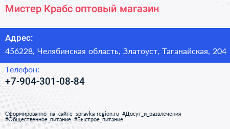Мистер Крабс, оптовый магазин по адресу 456228, Челябинская область, Златоуст, Таганайская, 204 в дальнейшем Организация, размещена в следующих категориях: