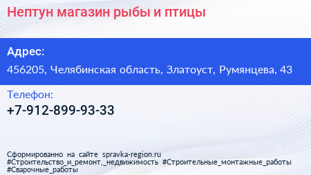 Нептун, магазин рыбы и птицы по адресу 456205, Челябинская область, Златоуст, Румянцева, 43 в дальнейшем Организация, размещена в следующих категориях: