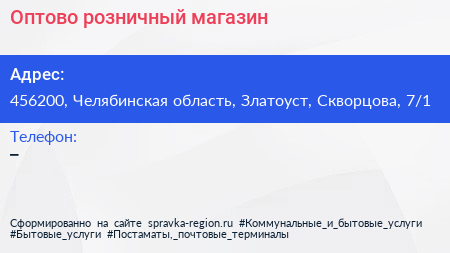 Оптово-розничный магазин по адресу 456200, Челябинская область, Златоуст, Скворцова, 7/1 в дальнейшем Организация, размещена в следующих категориях: