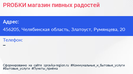 PROБКИ, магазин пивных радостей по адресу 456205, Челябинская область, Златоуст, Румянцева, 20 в дальнейшем Организация, размещена в следующих категориях: