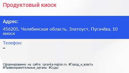 Продуктовый киоск по адресу 456205, Челябинская область, Златоуст, Пугачёва, 10 киоск в дальнейшем Организация, размещена в следующих категориях: