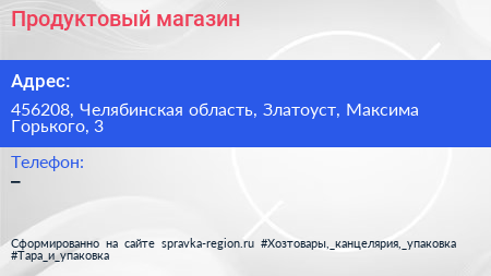 Продуктовый магазин по адресу 456208, Челябинская область, Златоуст, Максима Горького, 3 в дальнейшем Организация, размещена в следующих категориях: