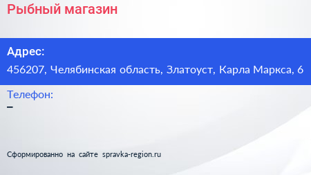 Рыбный магазин по адресу 456207, Челябинская область, Златоуст, Карла Маркса, 6 в дальнейшем Организация, размещена в следующих категориях: