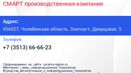 СМАРТ, производственная компания по адресу 456217, Челябинская область, Златоуст, Дворцовая, 5 в дальнейшем Организация, размещена в следующих категориях:
