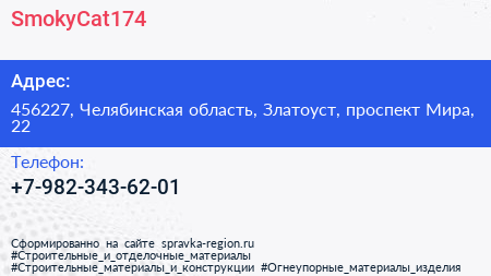 SmokyCat174 по адресу 456227, Челябинская область, Златоуст, проспект Мира, 22 в дальнейшем Организация, размещена в следующих категориях: