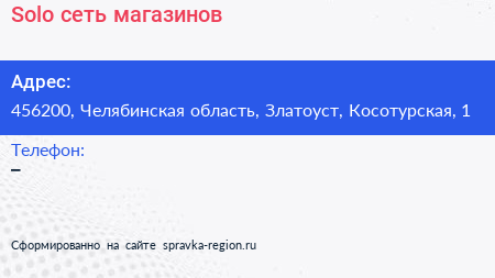 Solo, сеть магазинов по адресу 456200, Челябинская область, Златоуст, Косотурская, 1 в дальнейшем Организация, размещена в следующих категориях: