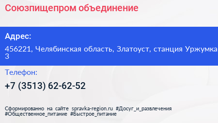 Союзпищепром, объединение по адресу 456221, Челябинская область, Златоуст, станция Уржумка, 3 в дальнейшем Организация, размещена в следующих категориях: